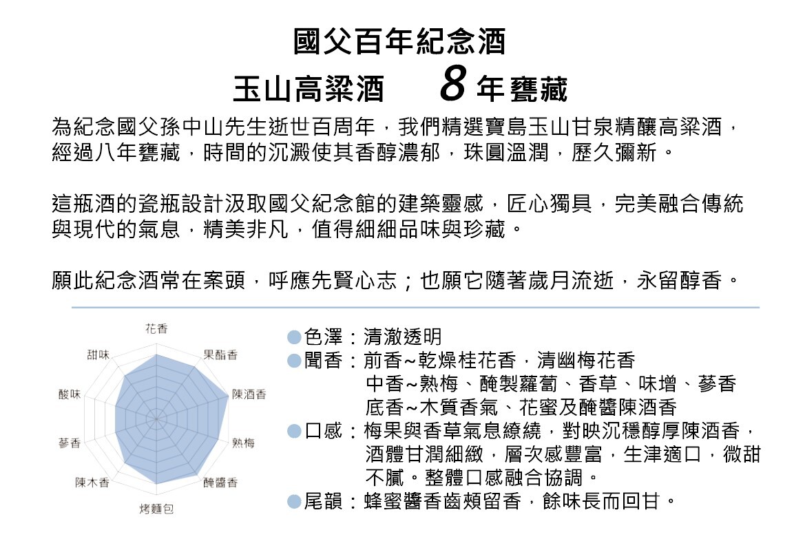 嚴選上等高粱,傳統陶甕窖藏八年,為紀念國父孫中山先生的精神與風範而限量推出。瓶身設計靈感源自國父紀念館建築,典雅中展現文化底蘊。酒體醇厚、風味層次分明,餘韻悠長,無論珍藏或饋贈皆極具意義。