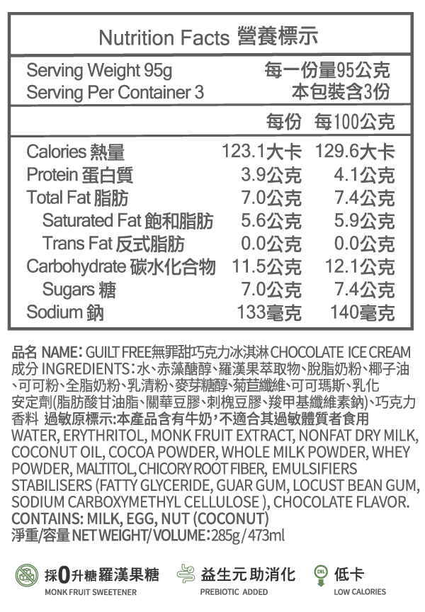 The “Guilt Free” ice cream - It has 2/3 fewer calories than the regular ice cream, Low calories, Low carbs , prebiotic added and sweetened with monk fruit. It is great news for no sugar diet.